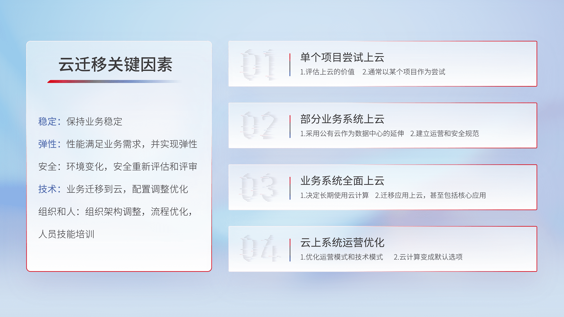 结合实际业务,,从规划设计、、、云平台选型、、、云原生改造、、、、数据迁移、、、集成交付,,,迁移全过程为客户识别最佳上云路径,,做好风险识别管理,,,设计网络架构、、身份权限、、、安全审计合规、、、操作审计、、、日志审计、、、监控告警策略、、、、多站点容灾设计等,,,对云上基础设施进行整体规划,,,,提升IT治理水平,,,,以满足弹性、、、高可用、、、高性能的需求。。。